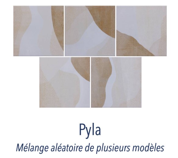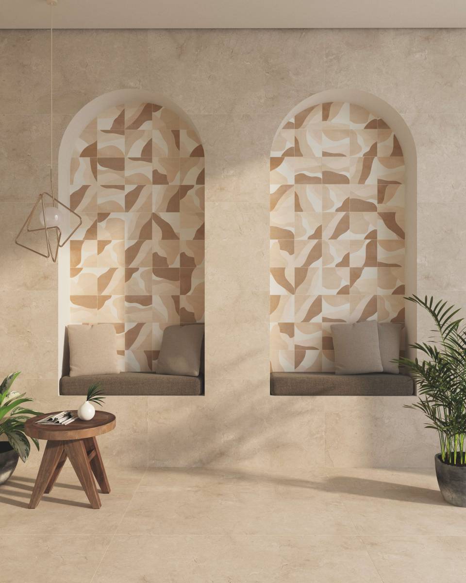 20×20 cm, finition mate avec émaillage doré sélectif, proposés en mélange aléatoire de motifs inspirés des dunes. Parfaits pour un revêtement mural intérieur élégant, doux et lumineux.